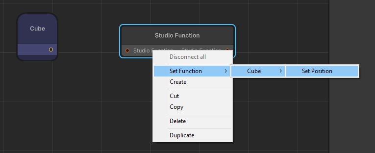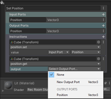In this example, I’ll be creating a function to set the position of my cube. To do this, I need to have a Vector3 input port so that I can use Vector chips in-game to control the position of my cube. If you want to change type, you’ll need to remove the port and add a new one. To remove one, click the 3 dots next to it and click “Remove Input Port”.
