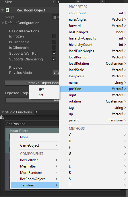Studio Functions are a Rec Room Studio feature that enables you to author custom chips that call GameObject and Component methods on your Rec Room Objects. Studio Functions support a wider variety of data types and can call C# methods with any number of parameters. Studio Functions can also forward the return values from C# methods to other chips in your room’s Circuit graph. Want to locally set the Position and Rotation of your object? You now can! Most GameObject and Component methods and properties are supported, so if there’s one you’d like to know more about, you can look it up here