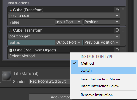 You can change an instruction from a method to a switch. A switch acts the same as it does in Circuits, where it will compare between Input Port values that are either a bool, a string or an int. To turn your instruction into a switch, select the 3 dots next to the object selected in your instruction and choose Switch under Instruction Type.
