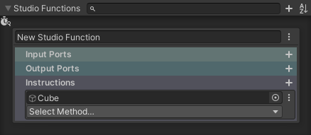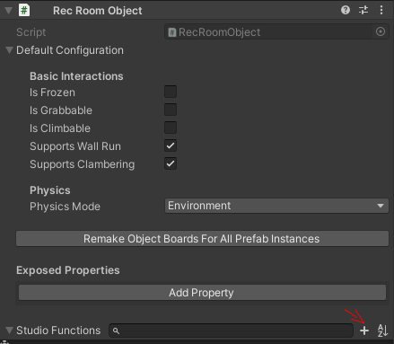 Select a Studio Prop in your scene (for more information on Studio Props see Creating Custom Rec Room Studio Objects). In the Unity Inspector tab you will see a new section titled Studio Functions. Prefabs created before the introduction of Studio Functions will see both UnityEvents and Studio Functions, but new prefabs will only see Studio Functions. Click the [+] button next to the functions search bar to add your first Studio Function.