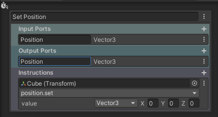 Then, I’ll add an instruction to send the vector3 of the Cube’s position to the Output port. First, I click the + button to the right of Instructions to add a new Instruction. Once again, I drag the game object Cube onto the game object input line and this time select “position” and “get” (position.get). Last, I’ll select the Output port as the destination for the position.set value.