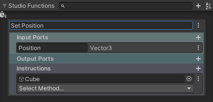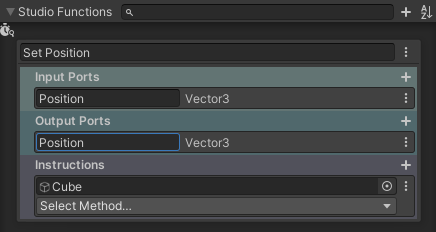 Output Ports are the output pins on your Studio Function chip. Similar to Input Ports, you can add an Output Port by clicking the + next to it, give it a name and select the type you’d like to expose as an output. For this function, I’m going to add an Output Port of the position of my cube.