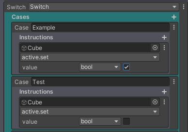 Select an input port next to “Switch”. You can then add new cases by hitting the + next to “Cases” The value on each case is the one you want to compare to the input port. In this example, I’m using a string and comparing it with “Example” and “Test”. One enables my GameObject, while the other disables it.